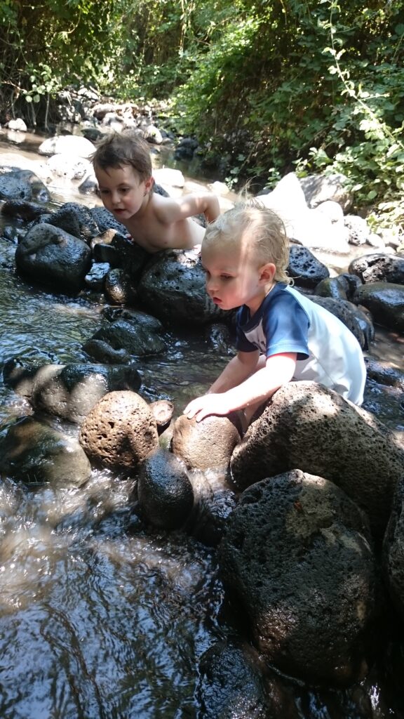 Vzpomínám… Na výlety před osmi lety, kdy jsme vozili jenom dva prcky a sdíleli s nimi nadšení z každý louže… Teď už studená voda z pramene rozzáří očka jen princezně. Daniel se ještě dá urvat na přítomnost rybek, ale Nevo sotva smočí palec, ještě s otráveným ksichtem. A pokud si chtějí hodit šutrem do vody, už to vůbec nepůsobí roztomile, ehm ;). Eitan si zaplave rád, ale stejně ochotně se nechá strhnout stěžováním milovaného staršího bratra. No, co naděláme, rostou. Díky Bohu, že jo ;).
