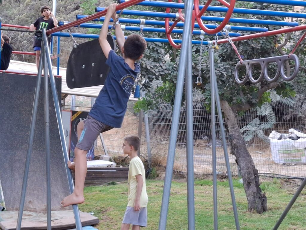 Kuku. Ginger objevuje dům z venku.Eitan v bazénu na hydroterapiiVenkovní fitko – zatímco brácha má kroužekTáboráky na LagBaOmer v Tal El