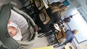 A je to, jsme na řadě. Moshe nás volá dovnitř a polohlasem sděluje, že nás s Revital vychválili až do nebe, že máme od nich skvělej report a že my to dát musíme. Protočila jsem panenky, že akorát budou mít soudci moc vysoký očekávání (no mně se člověk nezavděčí, co…) a s kočárem s Eitanem třeštícím na mě oči, jsme vstoupili. Noam i Moshe seděli s námi proti třem dajanům. Prostřední, co byl za drsňáka, se do mě hned pustil: