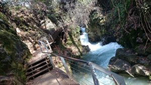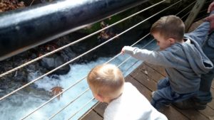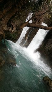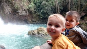 Z parkoviště v horní části přírodní rezervace Banias jsme ve dvanáct vyráželi na kamenitou stezku s výhledem na svěže zelené kopce Golanských výšin. Já i Giyora pro jistotu vybavení nosítky. Obě mláďata kupodivu bez odmlouvání ťapala, na můj vkus až příliš svižně. Zvlášť Nevova neustálá snaha chodit po lemování cesty, za kterým se kopec ostře lámal k říčce v údolí, mě dost znervózňovala. Samozřejmě protestoval proti tomu, abych ho držela za ruku, ale můj mateřský pud udržet dítě v bezpečí byl silnější. Giyora dal Danielovi jako správnej otec o chviličku víc volnosti, ale protože prcek za pár metrů na pozvolně klesajícím schodovitém terénu uklouz a lehce si nabil, dál i oni dva pokračovali ruku v ruce. Když jsme klikatící se stezkou doklesali až k říčce, bylo jasné, že mé obavy hned tak nepoleví. Kluzké schody sice vystřídala rovná dřevěná lávka, ale na můj vkus úzká a se zábradlím, které by dvouletýmu dítěti v pádu nebo skoku dolů zabránilo dost těžko. Už jsme děti nedrželi za ruce, ale za zápěstí. Kluci byli z bouřící vody nadšení, strašně je bavilo házet dolů listy a pozorovat, co se tam s nimi děje. Mně naopak drtila představa, že se to samý stane s mým potomkem a tlačila jsem je odtamtud pryč. Charakter stezky se bohužel neměnil, navíc jsme často stoupali nebo klesali po schodech. Dětem ten terén zřejmě přišel děsně zajímavej, protože ani Daniel, který obvykle po pár metrech fňuká, že chce nosit, to tentokrát ne a ne vzdát. A přitom mně by se s tím dvanáctikilovým závažím šlo o tolik snáz než se to pořád snažit držet, jistit, chytat a já nevím co. V cíli cesty pod vodopádem Banias jsme se potkali s několika třídami výletnících teenagerů a na dřevěném mokrém molu byla pěkná tlačenice. Giyora se nenechal zastrašit a procpal kluky až úplně dopředu a oba postavil na zábradlí. Foukal lehký vítr a z vodopádu na nás prášila voda, což se klukům moc líbilo.