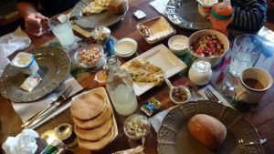 Páteční večeře byla poprvé za přítomnosti švagra i jeho manželky a dvou velkých holek. Jen nejmladší syn zůstal doma, že mu není dobře. Když u nás byli v lednu, manželka byla s jednou dcerou na prodlouženém víkendu v Evropě (druhá je na vojně, na prodloužený víkendy si ještě rok a půl musí nechat zajít chuť). A na to nemám nejlepší vzpomínky, protože švagr a jeho dvě děti, co tu zůstaly, byli většinu večera přilepení k telefonu a zvedali hlavu jen pro sarkastické komentáře rituálů. Giyorovy obě již odrostlé ratolesti se připojily také. Nevím, co bylo tentokrát jinak, ale bylo to nečekaně fajn. Přivezli nám košér parvé dezert, abychom ho mohli po masové večeři jíst. Místo nepříjemných komentářů švagr přidával k dobru, co vlastně sám ví díky tomu, že pracuje u ortodoxních židů a několik šabatových večeří s nimi absolvoval. Když jeho žena, která je proti věřícím hodně vysazená, házela k „dobru“ nějaké historky, co slyšela od své praktikující židovské kolegyně, švagr dokonce věřící hájil. Rituály přešli bez poznámek a s upřímnými úsměvy, když viděli, jak naši drobci i Giyorovi velcí kluci oplachují ruce a odříkavájí naučené požehnání. Odjeli krátce po večeři a ač bylo teprve deset, vzala jsem to přes sprchu rovnou do postele, jak jsem byla znavená, protože jsme se ten den v poledne vrátili z naší minidovči v Golanských výšinách.